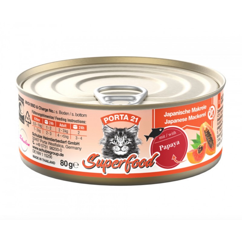 La gama Superfood de Porta 21 son un alimento completo para el gato, elaborado con pescado fresco rico en proteínas y enriquecido con "superalimentos" como potenciadores de vitaminas y minerales.