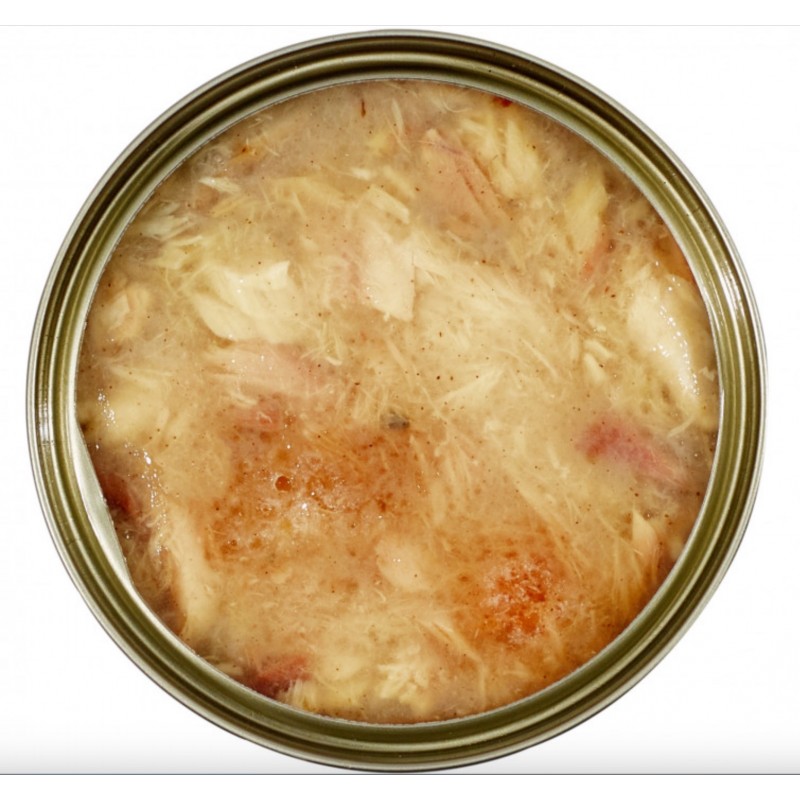 - Caldo de pescado, caballa japonesa (saba) 42%, papaya 3%, harina de tapioca, minerales, aceite de girasol.