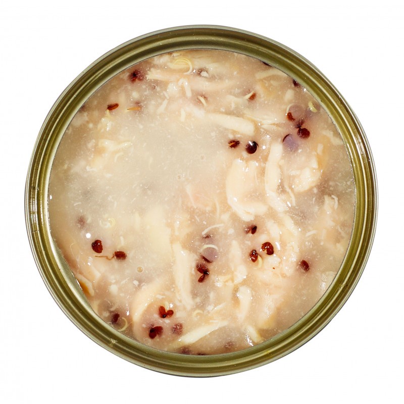 - Caldo de pollo, carne de pollo 42%, quinoa 3%, harina de tapioca, minerales, aceite de girasol.