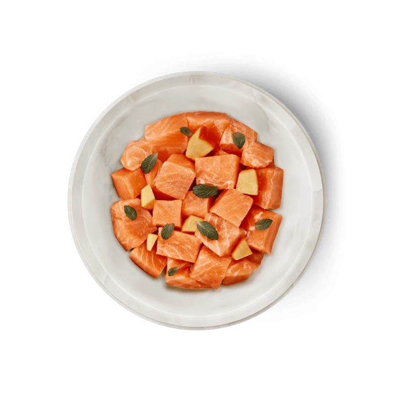 Filete de salmón (90 %), calabacín (4 %), tomate en polvo, hierba gatera*