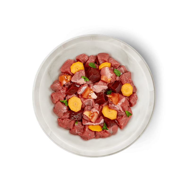 Corazón de buey (58 %), pulmón de buey (14 %), hígado de buey (14 %), carne muscular de buey (4 %), zanahoria (4 %), tomate en polvo, aceite de colza, hierba gatera*, minerales